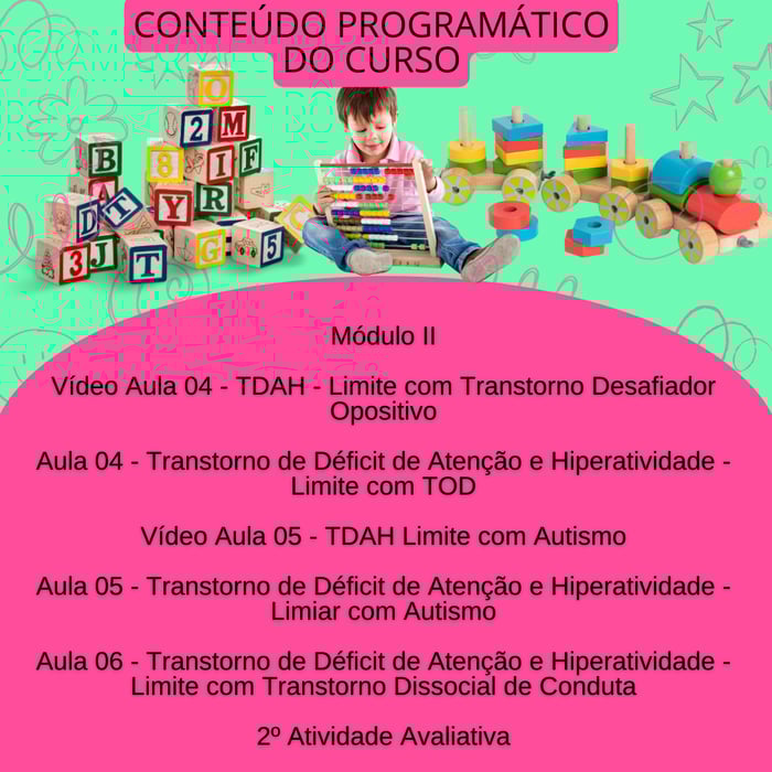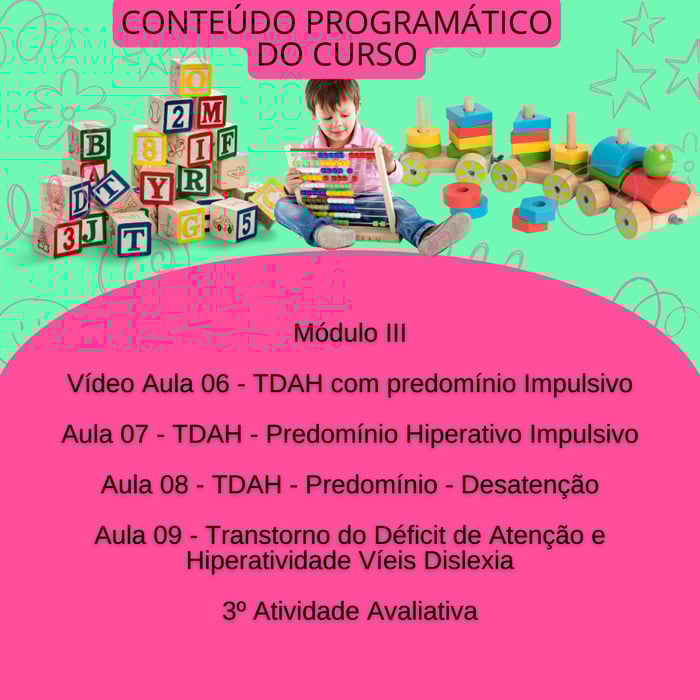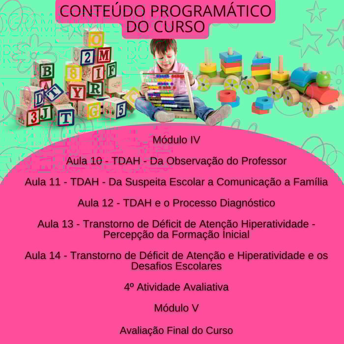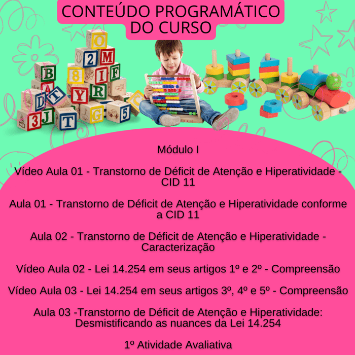 O Curso TDAH e suas interfaces no ambiente escolar, tem como proposta, subsidiar profissionais de educação e áreas afins, no que se refere a legislação em vigência, bem como as especificidades do TDAH no campo educacional.